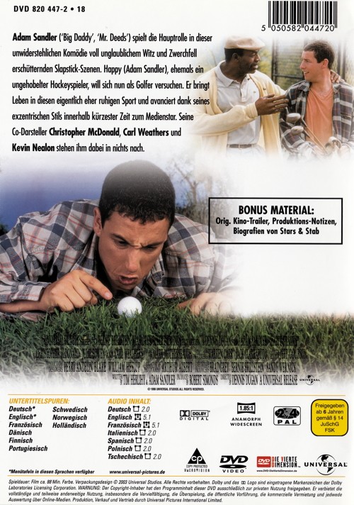 Adam Sandler ("Big Daddy", "Mr. Deeds") spielt die Hauptrolle in dieser unwiderstehlichen Komödie voll unglaublichem Witz und Zwerchfell erschütternden Slapstick-Szenen. Happy Gilmore (Adam Sandler), ehemals ein ungehobelter Hockeyspieler, will sich nun als Golfer versuchen. Er bringt Leben in diesen eigentlich eher ruhigen Sport und avanciert dank seines exzentrischen Stils innerhalb kürzester Zeit zum Medienstar. Seine Co-Darsteller Christopher McDonald, Carl Weathers und Kevin Nealon stehen ihm dabei in nichts nach.