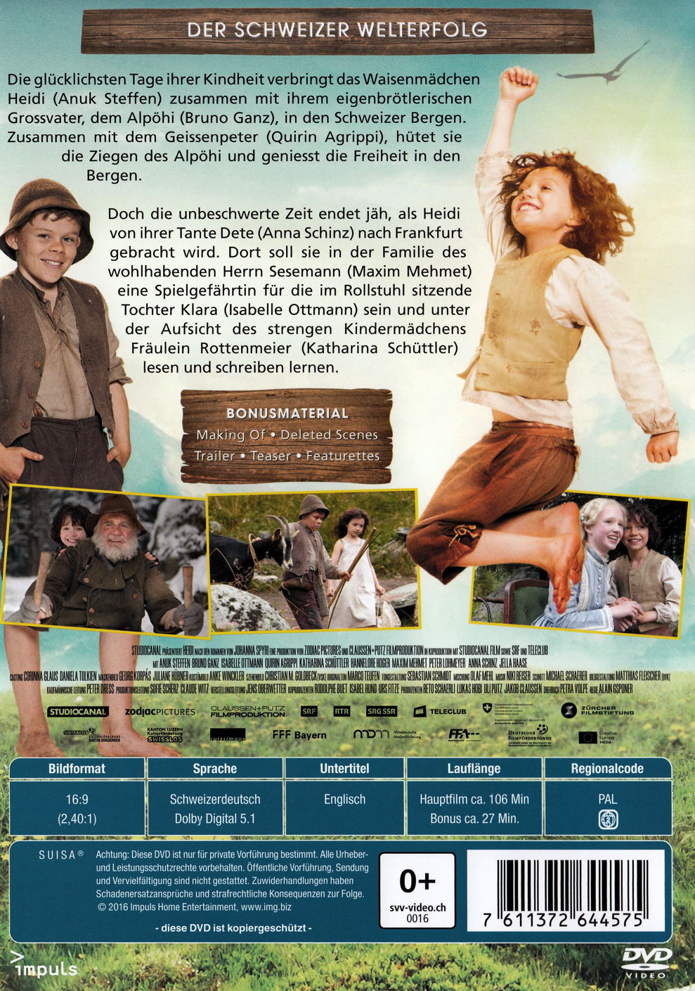 Die glücklichsten Tage ihrer Kindheit verbringt das Waisenmädchen Heidi zusammen mit ihrem eigenbrötlerischen Grossvater, dem Almöhi, abgeschieden in einer einfachen Holzhütte in den Schweizer Bergen. Zusammen mit ihrem Freund, dem Geissenpeter, hütet sie die Ziegen des Almöhi und geniesst die Freiheit in den Bergen in vollen Zügen. Doch die unbeschwerte Zeit endet jäh, als Heidi von ihrer Tante Dete nach Frankfurt gebracht wird. Dort soll sie in der Familie des wohlhabenden Herrn Sesemann eine Spielgefährtin für die im Rollstuhl sitzende Tochter Klara sein und unter der Aufsicht des strengen Kindermädchens Fräulein Rottenmeier lesen und schreiben lernen. Obwohl sich die beiden Mädchen bald anfreunden und Klaras Oma in Heidi die Leidenschaft für Bücher erweckt, wird die Sehnsucht nach den geliebten Bergen und dem Almöhi immer stärker...