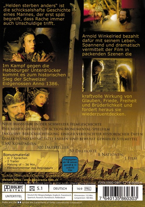 Erzählt wird eine der bekanntesten Schweizer Legenden, jene von Arnold Winkelried, der sich - so will es die Sage - bei der Schlacht von Sempach uneigennützig in die Lanzen des Habsburger Heeres geworfen hat und so den Eidgenossen eine Bresche schlug. Guter Stoff für ein Heldenepos, und wahrhaft episch sind auch die Zahlen, mit denen «Helden sterben anders» aufwarten kann: Zweieinhalb Stunden Spielzeit, 1500 Komparsen, 50 Drehorte und noch so einiges mehr. Das hört sich nach einer ganz grossen Kiste an, wie man sie normalerweise nur aus Hollywood kennt. Tatsächlich aber ist der Film Ivo Saseks keine finanziell grosszügig ausgestattete Grossproduktion, sondern ein Amateurstreifen, der praktisch ohne Geld, dafür aber mit umso mehr Einsatz der Beteiligten produziert wurde. Special Features * 2 Trailer * Making Of - 36min * Filmkommentar des Regisseurs - Untertitel: Englisch, Französisch, Deutsch für Hörgeschädigte, Holländisch, Rumänisch, Russisch, Spanisch