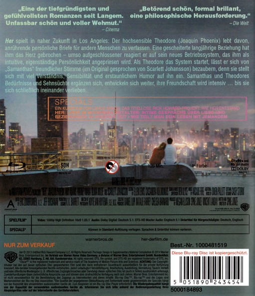 "Her" spielt in naher Zukunft in Los Angeles: Der hochsensible Theodore lebt davon, anrührende persönliche Briefe für andere Menschen zu verfassen. Seine gescheiterte langjährige Beziehung hat ihm das Herz gebrochen - umso aufgeschlossener reagiert er auf sein neues Betriebssystem, das ihm als intuitive, eigenständige Persönlichkeit angepriesen wird. Als Theodore das System startet, lässt er sich von "Samanthas" freundlicher Stimme bezaubern, denn sie stellt sich mit viel Verständnis, Sensibilität und erstaunlichem Humor auf ihn ein. Samanthas und Theodores Bedürfnisse und Sehnsüchte ergänzen sich, entwickeln sich weiter, ihre Freundschaft wird intensiver - bis sie sich schließlich ineinander verlieben.