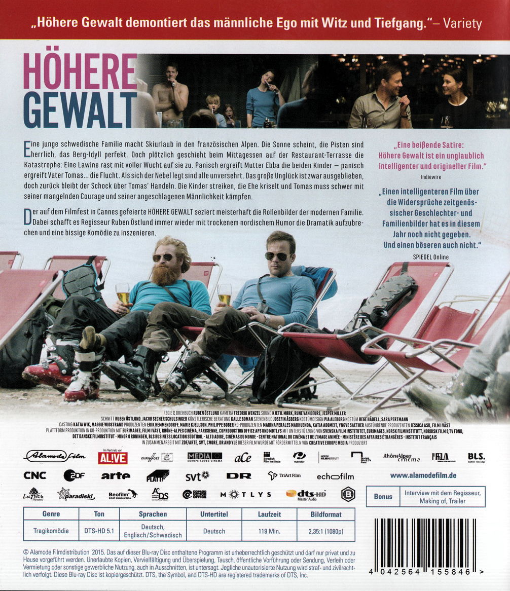 Eine junge schwedische Familie macht Skiurlaub in den französischen Alpen. Die Sonne scheint, die Pisten sind herrlich, das Berg-Idyll perfekt. Doch plötzlich geschieht beim Mittagessen auf der Restaurant-Terrasse die Katastrophe: Eine Lawine rast mit voller Wucht auf sie zu. Panisch ergreift Mutter Ebba die beiden Kinder - panisch ergreift Vater Tomas... die Flucht. Als sich der Nebel legt, sind alle unversehrt. Das grosse Unglück ist zwar ausgeblieben, doch zurück bleibt der Schock über Tomas' Handeln. Die Kinder streiken, die Ehe kriselt und Tomas muss schwer mit seiner mangelnden Courage und seiner angeschlagenen Männlichkeit kämpfen.