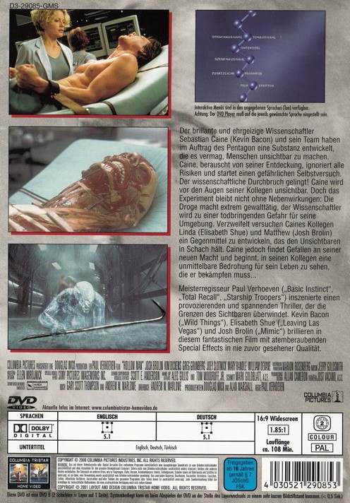 Der brillante und ehrgeizige Wissenschaftler Sebastian Caine (Kevin Bacon) und sein Team haben im Auftrag des Pentagon eine Substanz entwickelt, die es vermag, Menschen unsichtbar zu machen. Caine, berauscht von seiner Entdeckung, ignoriert alle Risiken und startet einen gefährlichen Selbstversuch. Der wissenschaftliche Durchbruch gelingt! Caine wird vor den Augen seiner Kollegen unsichtbar. Doch das Experiment bleibt nicht ohne Nebenwirkungen Die Droge macht extrem gewalttätig, der Wissenschaftler wird zu einer todbringenden Gefahr für seine Umgebung. Verzweifelt versuchen Caines Kollegen Linda (Elisabeth Shue) und Matthew (Josh Brolin) ein Gegenmittel zu entwickeln, das den Unsichtbaren in Schach hält. Caine jedoch findet Gefallen an seiner neuen Macht und beginnt, in seinen Kollegen eine unmittelbare Bedrohung für sein Leben zu sehen, die er bekämpfen muss...