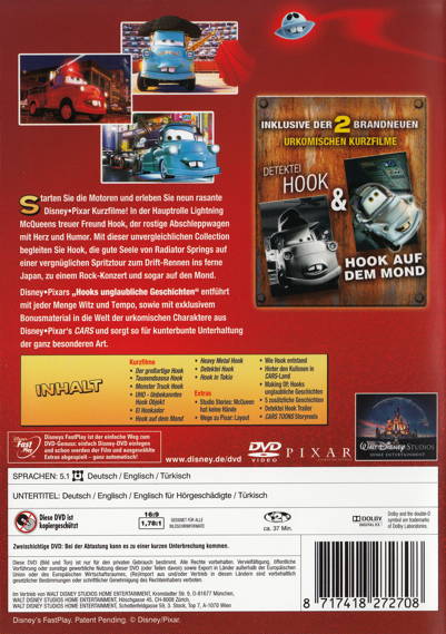 Starten Sie die Motoren und erleben Sie neun rasante Disney Pixar Kurzfilme! In der Hauptrolle Lightning McQueens treuer Freund Hook, der rostige Abschleppwagen mit Herz und Humor. Mit dieser unvergleichlichen Collection begleiten Sie Hook, die gute Seele von Radiator Springs auf einer vergnüglichen Spritztour zum Drift-Rennen ins ferne Japan, zu einem Rock-Konzert und sogar auf den Mond. Disney Pixars "Hooks unglaubliche Geschichten" entführt mit jeder Menge Witz und Tempo, sowie mit exklusivem Bonusmaterial in die Welt der urkomischen Charaktere aus Disney Pixar's CARS und sorgt so für kunterbunte Unterhaltung der ganz besonderen Art.