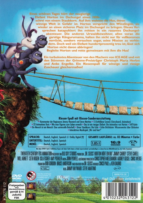 Eines schönen Tages hört der neugierige Elefant Horton im Dschungel einen Hilfeschrei von einem Staubkorn. Auf ihm wohnen die Hus, deren winzige Welt in Gefahr ist. Horton verspricht den Winzlingen, sie wieder an einen sicheren Platz im Dschungel zu bringen. Dieses Versprechen katapultiert ihn mitten in ein rasantes Dschungelabenteuer. Die anderen Urwaldbewohner, allen voran die garstige Kängurumama, halten ihn nicht nur für vollkommen verrückt, sondern versuchen sogar, seine Mission zu verhindern. Doch weil ein Elefant hundertprozentig treu ist, lässt sich Horton nicht davon abbringen!
