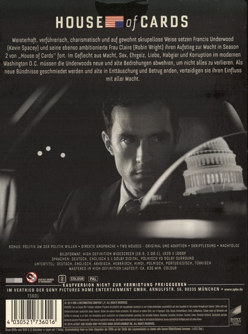 Meisterhaft, verführerisch, charismatisch und auf gewohnt skrupellose Weise setzen Francis Underwood und seine ebenso ambitionierte Frau Claire ihren Aufstieg zur Macht in Season 2 von "House of Cards" fort. Im Geflecht aus Macht, Sex, Ehrgeiz, Liebe, Habgier und Korruption im modernen Washington D.C. müssen die Underwoods neue und alte Bedrohungen abwehren, um nicht alles zu verlieren. Als neue Bündnisse geschmiedet werden und alte in Enttäuschung und Betrug enden, verteidigen sie ihren Einfluss mit aller Macht.