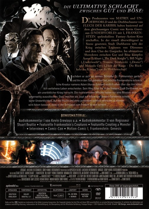 Nachdem er sich an seinem Schöpfer Dr. Frankenstein gerächt und ihn in den Tod getrieben hat, möchte Frankensteins schreckliche Kreatur namens Adam (Aaron Eckhart) endlich allein über das ihm künstlich verliehene Leben entscheiden. Sein Weg führt ihn in die finstere Stadt Darkhaven, wo ein unerbittlicher Krieg herrscht. Die rivalisierenden Mächte haben nur eine Mission: sich gegenseitig auszulöschen. Dazu machen sie Jagd auf Adam und dessen Geheimnis scheinbarer Unsterblichkeit. Auf der Flucht und ohne jemandem wirklich vertrauen zu können wird Adam bewusst, dass er der Schlüssel zum Frieden zu sein scheint...