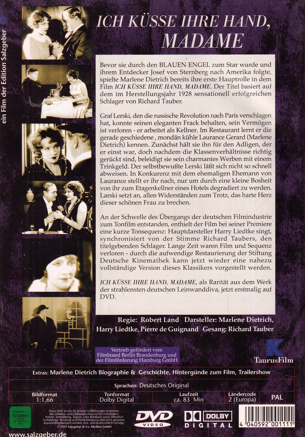 ICH KÜSSE IHRE HAND, MADAME, dessen Titel auf dem im Herstellungsjahr 1928 sensationell erfolgreichen Schlager von Richard Tauber basierte, handelt vom Grafen Lerski, den die russische Revolution nach Paris verschlagen hat. Seinen eleganten Frack hat er behalten, sein Vermögen ist verloren - er arbeitet als Kellner.