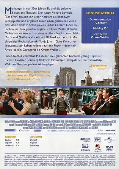 Als sich Richard auch noch in die ehrgeizige Regieassistentin Sonja Jones (Claire Danes) verliebt, gerät sein Leben vollends aus den Fugen - denn sein Rivale ist kein Geringerer als Orson Welles ...