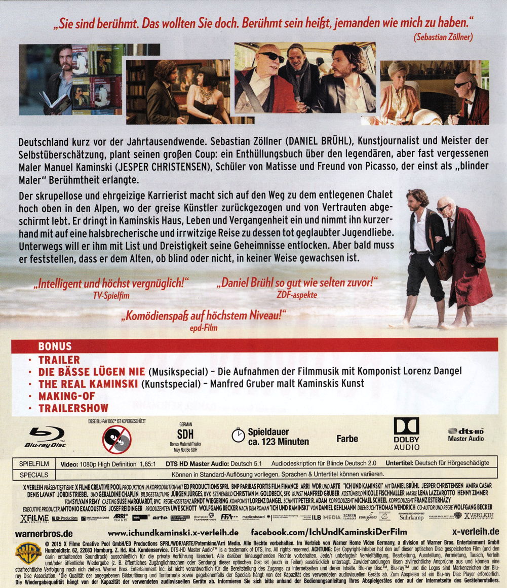 Deutschland kurz vor der Jahrtausendwende. Sebastian Zöllner , Kunstjournalist und Meister der Selbstüberschätzung, plant seinen grossen Coup: ein Enthüllungsbuch über den legendären, aber fast vergessenen Maler Manuel Kaminski, Schüler von Matisse und Freund von Picasso, der einst als blinder Maler Berühmtheit erlangte. Der skrupellose und ehrgeizige Karrierist macht sich auf den Weg zu dem entlegenen Chalet hoch oben in den Alpen, wo der greise Künstler zurückgezogen und von Vertrauten abgeschirmt lebt. Er dringt in Kaminskis Haus, Leben und Vergangenheit ein und nimmt ihn kurzerhand mit auf eine halsbrecherische und irrwitzige Reise zu dessen tot geglaubter Jugendliebe. Unterwegs will er ihm mit List und Dreistigkeit seine Geheimnisse entlocken. Aber bald muss er feststellen, dass er dem Alten, ob blind oder nicht, in keiner Weise gewachsen ist.