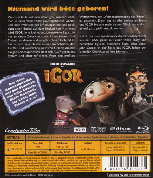 Irgendwo in der Welt existiert ein Ort, der voll ist mit verrückten Wissenschaftlern und ihren geisteskranken und psychopathischen Erfindungen. Jeder Wissenschaftler hat dabei seinen eigenen Igor, eine kleine, bucklige Kreatur, die ihre Leben nur einem Zweck widmet: ihrem Herrn und Meister zu dienen. Doch ein Igor stellt sich dagegen. Er hat den Traum, den grössten Wettbewerb, den "Wissenschaftspreis des Bösen" zu gewinnen. Damit steht er allerdings nicht alleine da...