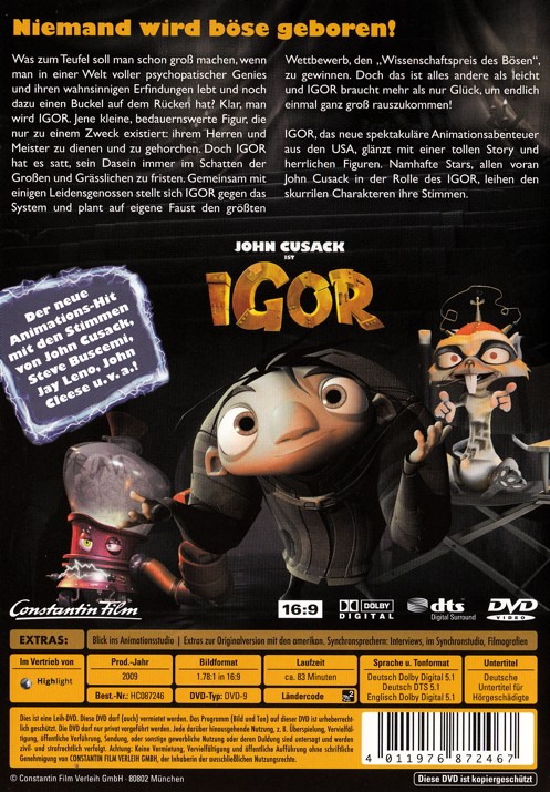 Irgendwo in der Welt existiert ein Ort, der voll ist mit verrückten Wissenschaftlern und ihren geisteskranken und psychopathischen Erfindungen. Jeder Wissenschaftler hat dabei seinen eigenen Igor, eine kleine, bucklige Kreatur, die ihre Leben nur einem Zweck widmet: ihrem Herrn und Meister zu dienen. Doch ein Igor stellt sich dagegen. Er hat den Traum, den grössten Wettbewerb, den "Wissenschaftspreis des Bösen" zu gewinnen. Damit steht er allerdings nicht alleine da...