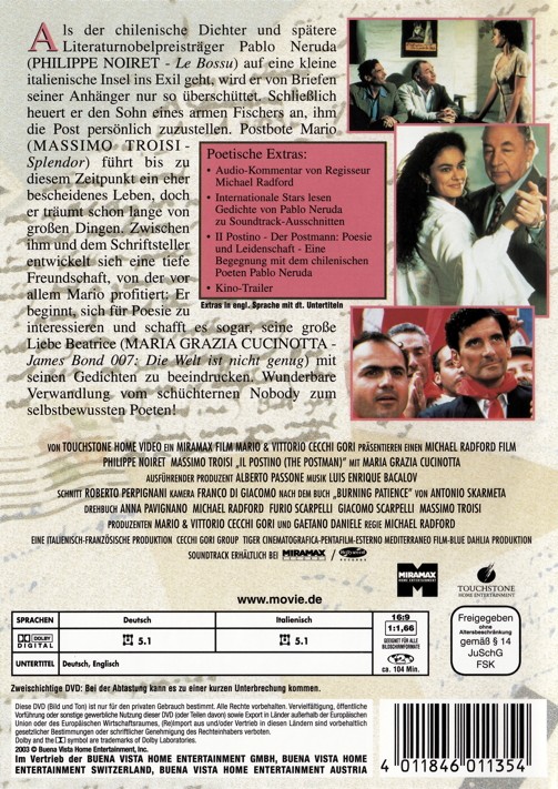 Der schüchterne Fischer Mario ist unsterblich verliebt in die schöne, aber unnahbare Beatrice, die in der Bar des Dorfes arbeitet. Als der große chilenische Liebesdichter Pablo Neruda mit seiner attraktiven, jungen Frau auf die süditalienische Insel ins Exil geht, beginnt für Mario eine neues Leben. Er nimmt die Stelle als Privat-Briefträger Nerudas an und bringt ihm täglich Berge von Post ins Haus, darunter unzählige Liebesbriefe. Langsam entwickelt sich eine Freundschaft zwischen den beiden ungleichen Männern. Angespornt von Nerudas Erfolg bei Frauen beginnt Mario dessen Gedichte zu lesen und sich vom großen Dichter in die Geheimnisse seines Erfolges einweihen zu lassen. Endlich faßt Mario den Mut, mit Nerudas Worten, die er als seine eigenen ausgibt, um die sinnliche Beatrice zu werben...