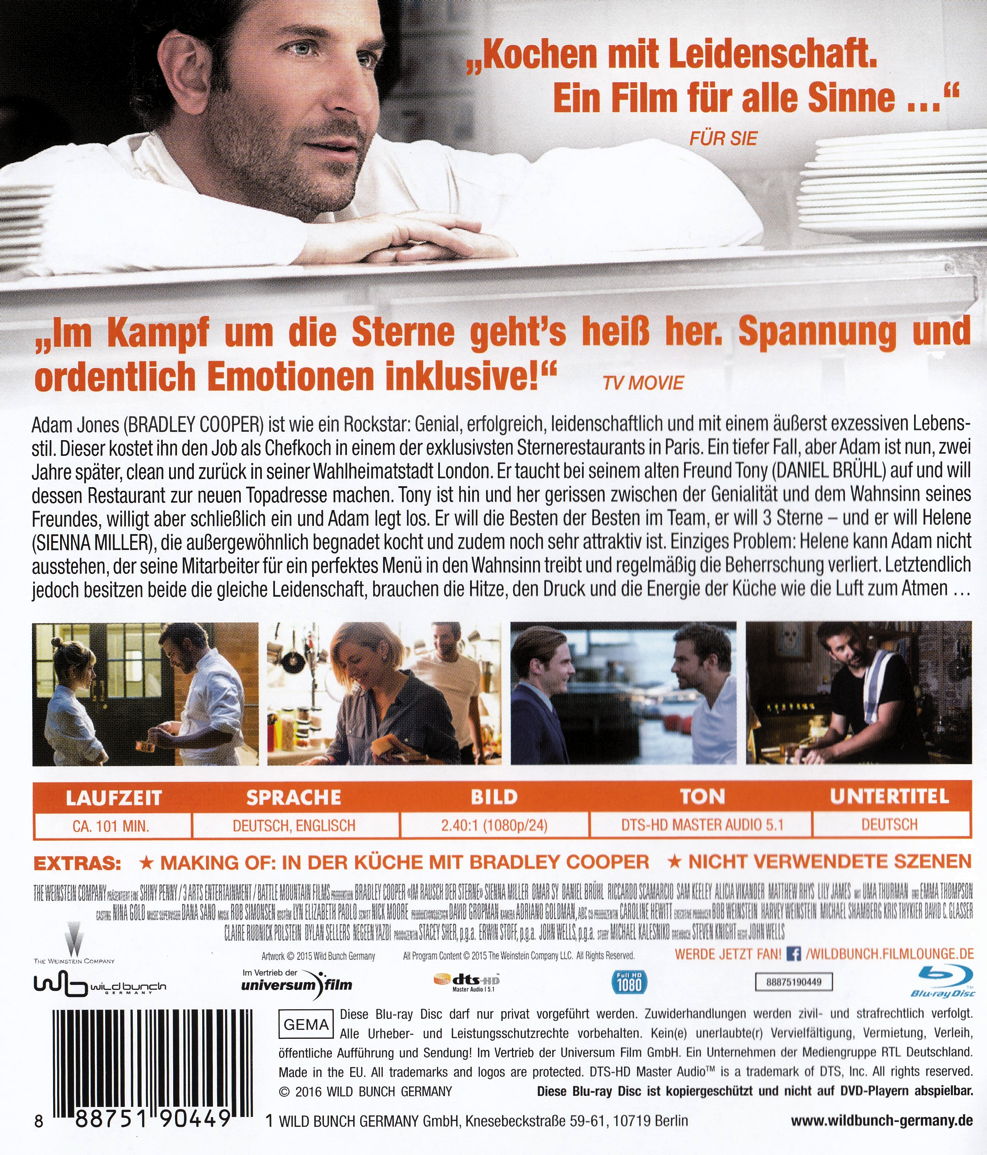 Adam Jones ist wie ein Rockstar: Genial, erfolgreich, leidenschaftlich und mit einem äusserst exzessiven Lebensstil. Dieser kostet ihn den Job als Chefkoch in einem der exklusivsten Sternerestaurants in Paris. Ein tiefer Fall, aber nach über zwei Jahren ist Adam Jones clean und zurück in seiner Wahlheimatstadt London. Er taucht bei seinem alten Freund Tony auf und will dessen Restaurant zur neuen Topadresse machen. Tony ist hin und her gerissen zwischen der Genialität und dem Wahnsinn seines Freundes, willigt aber schliessich ein und Adam legt los. Er will die Besten der Besten im Team für sein bahnbrechendes Restaurant, er will 3 Sterne - und er will Helene, die aussergewöhnlich begnadet kocht und zudem noch sehr attraktiv ist. Einziges Problem: Helene kann Adam nicht ausstehen, der wie ein Besessener seine Mitarbeiter für ein perfektes Menü in den Wahnsinn treibt und regelmässig die Beherrschung verliert. Letztendlich jedoch besitzen beide die gleiche Leidenschaft, brauchen die Hitze, den Druck und die Energie der Küche wie die Luft zum Atmen - aber Adam muss begreifen, dass sie nur im Team die Gourmetwelt Londons wirklich rocken können!