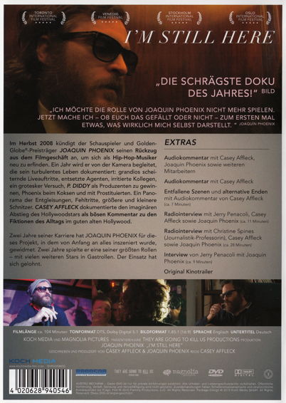 Im Herbst 2008 kündigt der Schauspieler und Golden-Globe-Preisträger Joaquin Phoenix ("Walk the Line") seinen Rückzug aus dem Filmgeschäft an, um sich als Hip-Hop-Musiker neu zu erfinden. "I'm Still Here" ist das eindrucksvolle Regiedebüt des Schauspielers Casey Affleck, der das darauf folgende, turbulente Jahr mit der Kamera begleitet und Dinge zeigt, die man so noch nicht gesehen hat: grandios scheiternde Liveauftritte, entsetzte Agenten, irritierte Kollegen, Ben Stiller, der Phoenix zu einer Rolle in "Greenberg" überreden will, ein grotesker Versuch, Puff Diddy als Produzenten zu gewinnen, Phoenix beim Koksen und mit Prostituierten, während seine Haare immer länger werden und sein Körper immer ungepflegter. Ein verdammt komisches Panorama der Entgleisungen, Fehltritte, größerer und kleinerer Schnitzer. Casey Affleck dokumentierte den imaginären Abstieg des Hollywoodstars als bösen Kommentar zu den Fiktionen des Alltags im guten alten Hollywood.