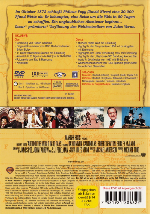 Im Oktober 1872 schliesst Phileas Fogg eine 20.000 Pfund-Wette ab. Er behauptet eine Reise um die Welt in 80 Tagen zu schaffen. Am nächsten Tag schon verlässt er mit seinem treuen Butler Passepartout London. Für beide wird es von Anfang an ein Unternehmen voller Abenteuer und Überraschungen. Von Detektiven verfolgt, von Indianern bedroht reisen sie mit Schiffen, Zügen, Ballons und Elefanten und entführen uns in ferne und exotische Länder.