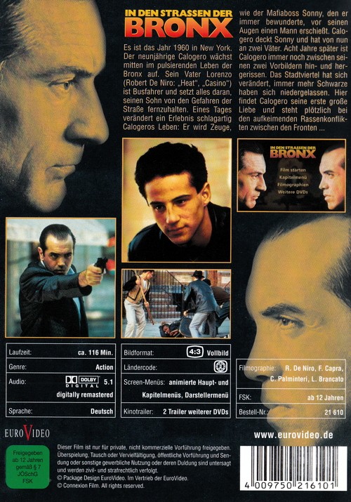 Es ist das Jahr 1960 in New York. Der neunjährige Calogero wächst mitten im pulsierenden Leben der Bronx auf. Sein Vater Lorenzo ist Busfahrer und setzt alles daran, seinen Sohn von den Gefahren der Strasse fernzuhalten. Eines Tages verändert ein Erlebnis schlagartig Calogeros Leben. Er wird Zeuge, wie der Mafia-Boss Sonny, den er immer bewunderte, vor seinen Augen einen Mann erschiesst. Calogero deckt Sonny und hat von nun an zwei Väter. Acht Jahre später ist Calogero immer noch zwischen seinen zwei Vorbildern hin- und hergerissen. Das Stadtviertel hat sich verändert, immer mehr Schwarze haben sich niedergelassen. Hier findet Calogero seine erste grosse Liebe und steht plötzlich bei den aufkeimenden Rassenkonflikten zwischen den Fronten...