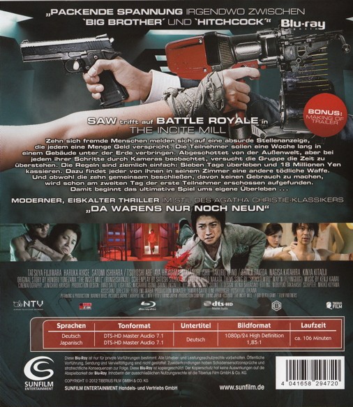 Zehn sich fremde Menschen melden sich auf eine absurde Stellenanzeige, die eine Menge Geld verspricht. Die Teilnehmer werden eine Woche lang in einem Gebäude eingeschlossen und beobachtet. Jeder von ihnen findet in seinem Zimmer eine andere, tödliche Waffe. Die Regeln sind ziemlich einfach: Das Experiment ist zu Ende sobald die sieben Tage vorbei sind oder sobald es nur noch zwei Überlebende gibt. Wenn innerhalb der Frist nichts passiert, geht jeder Teilnehmer mit über 18 Millionen Yen nach Hause. Das Spiel scheint einfach zu sein, doch am zweiten Tag wird einer der Teilnehmer erschossen aufgefunden. Damit beginnt das ultimative Spiel ums Überleben...