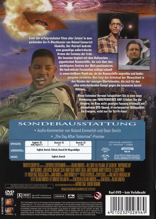 In dem packenden Sci-Fi-Blockbuster von Roland Emmerich bedroht eine gewaltige ausserirdische Armee die Existenz der Erde. Die Invasion beginnt mit dem Auftauchen gigantischer Raumschiffe, die sich über den wichtigsten Zentren der Welt positionieren. Die Faszination schlägt schnell in Panik um, als die Raumschiffe angreifen und bedingungslos alles zerstören. Nun liegt das Schicksal der Menschheit in den Händen der wenigen Überlebenden, die sich für den alles entscheidenden Kampf gegen die Invasoren bereit machen...