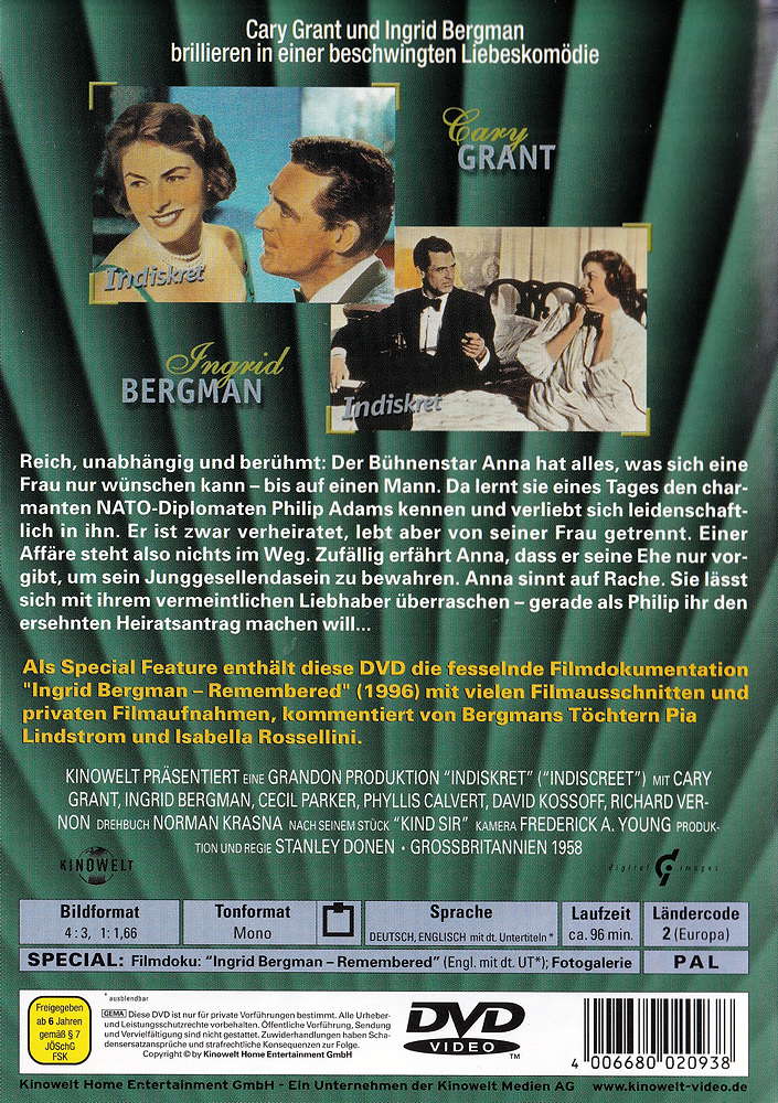 Norman Krasna, auf dessen Bühnenstück „Kind Sir“ die Inszenierung basiert, steuerte auch das Drehbuch zur Verfilmung bei. Ingrid Bergmans Ausruf „damned!“, als sie erfährt, dass ihr Geliebter bereits verheiratet ist, ging in die Filmgeschichte ein. Die beiden Hauptdarsteller wurden für ihre Darstellung in INDISKRET jeweils für den Golden Globe Award im Jahr 1959 nominiert.