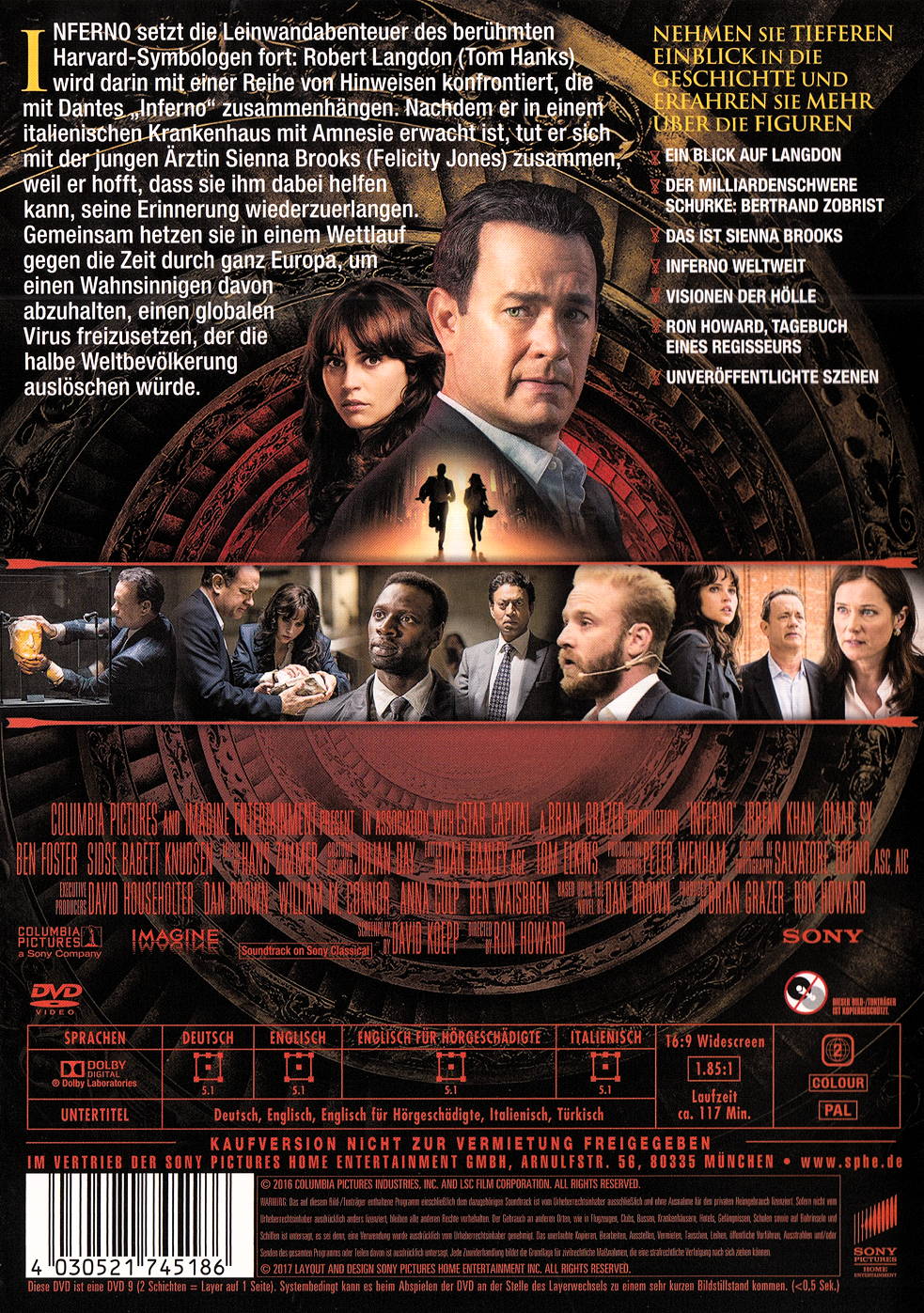 Inferno setzt die Leinwandabenteuer des berühmten Harvard-Symbologen fort: Robert Langdon wird darin mit einer Reihe von Hinweisen konfrontiert, die mit Dantes "Inferno" zusammenhängen. Nachdem er in einem italienischen Krankenhaus mit Amnesie erwacht ist, tut er sich mit der jungen Ärztin Sienna Brooks zusammen, weil er hofft, dass sie ihm dabei helfen kann, seine Erinnerung wiederzuerlangen. Gemeinsam hetzen sie in einem Wettlauf gegen die Zeit durch ganz Europa, um eine tödliche globale Bedrohung abzuwenden.