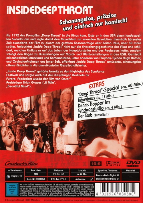 Als 1972 der Pornofilm "Deep Throat" in die Kinos kam, löste er einen landesweiten Skandal aus und legte damit den Grundstein zur sexuellen Revolution. Innerhalb kürzester Zeit avancierte der Film zu einem der grössten Kassenerfolge aller Zeiten. Nun, über 30 Jahre später, beleuchtet "Inside Deep Throat" nicht nur die Entstehungsgeschichte des Films und schildert, welchen Einfluss er auf das Leben der Hauptdarsteller und des Regisseurs hatte, sondern schlägt den Bogen zu Auswirkungen auf Moral- und Wertvorstellungen in den USA. Gemischt mit zahlreichen Interviews und Kommentaren, unter anderem von Playboy-Tycoon Hugh Hefner, und Originalaufnahmen aus jener Zeit offenbart "Inside Deep Throat" amüsante, schonungslos offene Einblicke in die amerikanische Gesellschaftskultur.