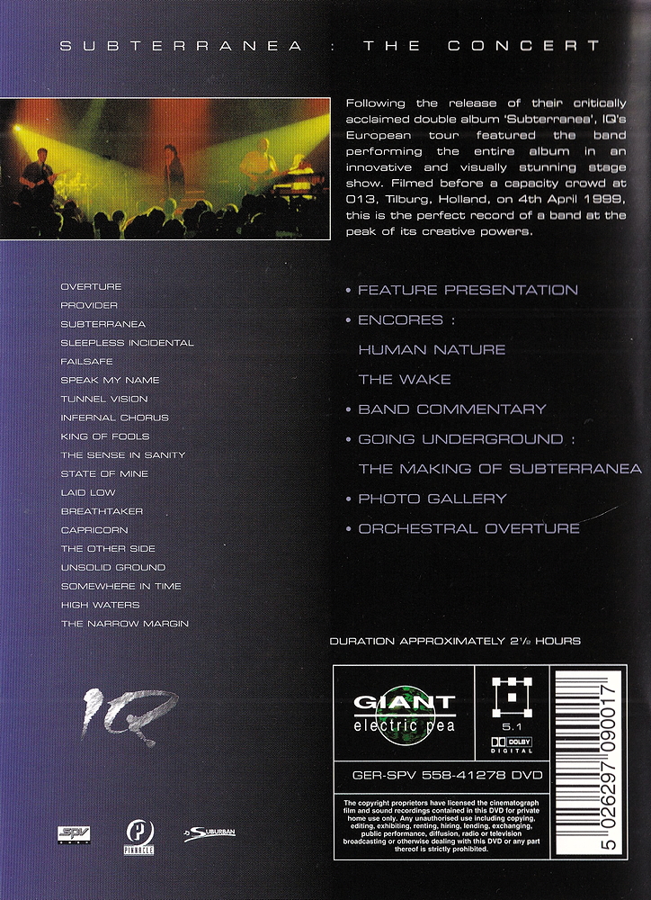 Following the release of their critically acclaimed double album Subteranea, IQ's European tour featured the band performing the entire album in an innovative and visually stunning stage show. Filmed before a capacity crowd at 013, Tilburg, Holland, on 4th April 1999, this is the perfect record of a band at the peak of its creative powers.
