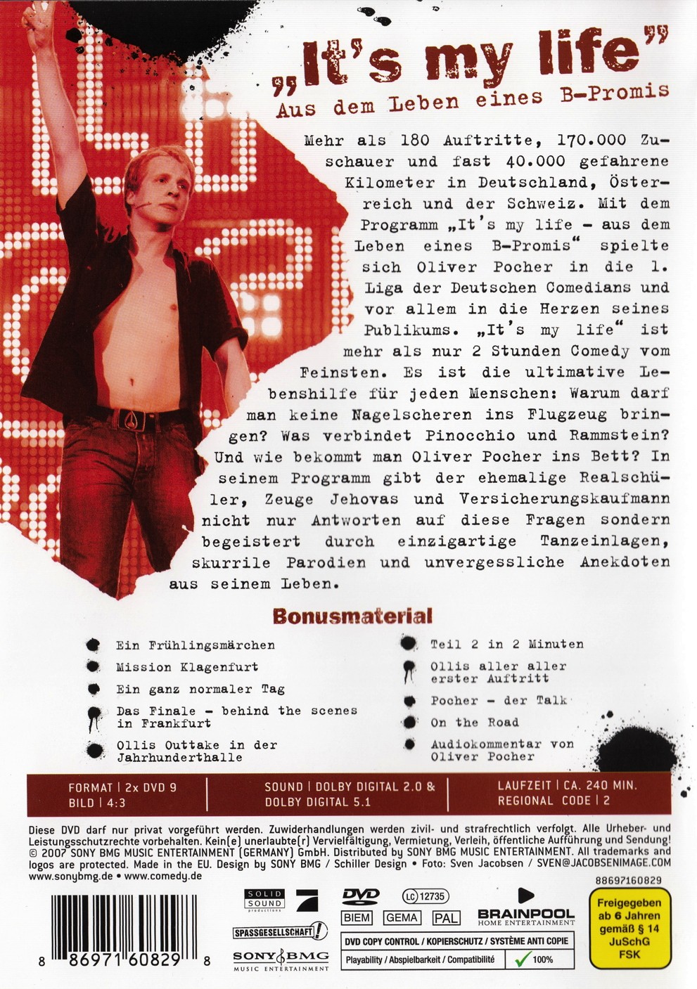 Mehr als 180 Auftritte, 170.000 Zuschauer und fast 40.000 gefahrene Kilometer in Deutschland, Österreich und der Schweiz. Mit dem Programm "It's my life - aus dem Leben eines B-Promis" spielte sich Oliver Pocher in die 1. Liga der Deutschen Comedians und vor allem in die Herzen seines Publikums. "It's my life" ist mehr als nur 2 Stunden Comedy vom Feinsten. Es ist die ultimative Lebenshilfe für jeden Menschen: Warum darf man keine Nagelscheren ins Flugzeug bringen? Was verbindet Pinocchio und Rammstein? Und wie bekommt man Oliver Pocher ins Bett? In seinem Programm gibt der ehemalige Realschüler, Zeuge Jehovas und Versicherungskaufmann nicht nur Antworten auf diese Fragen sondern begeistert durch einzigartige Tanzeinlagen, skurrile Parodien und unvergessliche Anekdoten aus seinem Leben.