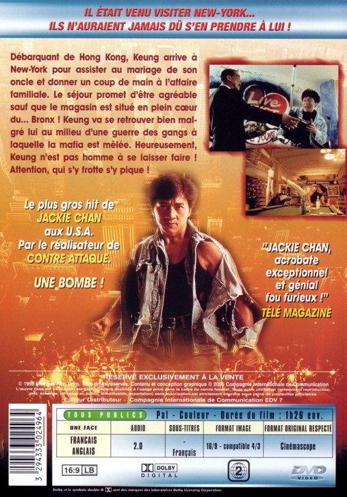 Débarquant de Hong Kong, Keung arrive à New-York pour assister au mariage de son oncle et donner un coup de main à l'affaire familiale. Le séjour promet d'être agréable sauf que le magasin est situé en plein coeur du... Bronx ! Keung va se retrouver bien malgré lui au milieu d'une guerre des gangs à laquelle la mafia est mêlée. Heureusement, Keung n'est pas homme à se laisser faire ! Attention, qui s'y frotte s'y pique !