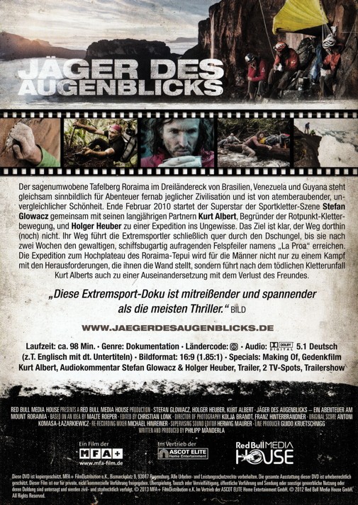 Der sagenumwobene Tafelberg Roraima im Dreiländereck von Brasilien, Venezuela und Guyana steht gleichsam sinnbildlich für Abenteuer fernab jeglicher Zivilisation und ist von atemberaubender, unvergleichlicher Schönheit. Ende Februar 2010 startet der Superstar der Sportkletter-Szene Stefan Glowacz gemeinsam mit seinen langjährigen Partnern Kurt Albert, Begründer der Rotpunkt-Kletterbewegung, und Holger Heuber zu einer Expedition ins Ungewisse. Das Ziel ist klar, der Weg dorthin (noch) nicht. Ihr Weg führt die Extremsportler schliesslich quer durch den Dschungel, bis sie nach zwei Wochen den gewaltigen, schiffsbugartig aufragenden Felspfeiler namens „La Proa“ erreichen. Die Expedition zum Hochplateau des Roraima-Tepui wird für die Männer nicht nur zu einem Kampf mit den Herausforderungen, die ihnen die Wand stellt, sondern führt nach dem tödlichen Kletterunfall Kurt Alberts auch zu einer Auseinandersetzung mit dem Verlust des Freundes