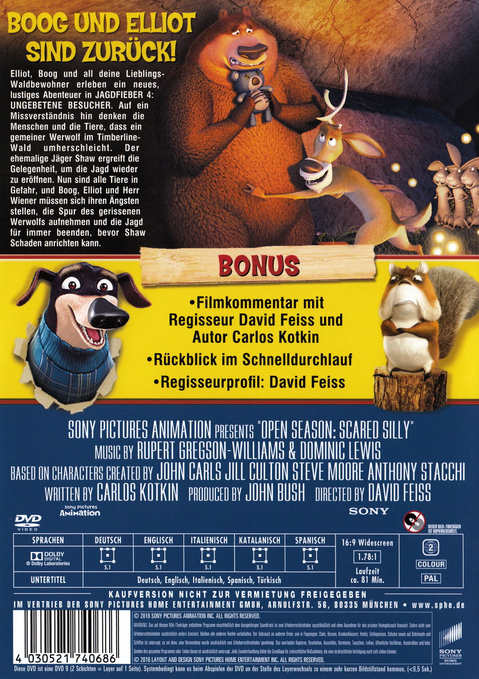 Elliot, Boog und alle unsere Lieblingstiere aus dem Wald melden sich in Open Season: Scared Silly mit einem brandneuen Comedy-Abenteuer zurück. Als aufgrund einer Verwechslung sowohl Tiere als auch Menschen davon überzeugt sind, dass im Timberline-Nationalpark ein Werwolf sein Unwesen treibt, müssen alle Tiere zusammenhalten und als Retter eingreifen.
