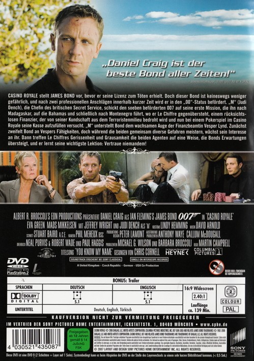 Jürgen Tarrach, Judi Dench, Daniel Craig, Ludger Pistor, Mads Mikkelsen, Jeffrey Wright, Ivana Milicevic, Giancarlo Giannini, Jesper Christensen, Isaach De Bankolé...Richard Sammel, Tsai Chin, Simon Abkarian, Eva Green, Clemens Schick, Caterina Murino, Claudio Santamaria, Tom Chadbon, Carlos Leal, Christina Cole, Malcolm Sinclair, Robert Jezek, Tobias Menzies, Crispin Bonham-Carter, Peter Brooke, Joseph Millson, Urbano Barberini, Jason Durran, Emmanuel Avena, Paul Bhattacharjee, Veruschka von Lehndorff, Sebastien Foucan, Lazar Ristovski, Diane Hartford, John Chancer, Daud Shah, Jessica Miller, Simon Cox, Andreas Daniel, Leo Stransky, John Gold, Rebecca Gethings, Charlie Levi Leroy, Jerry Inzerillo, Peter Notley