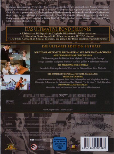 In diesem actionreichen Werk voller Skifahrten im Artilleriefeuer, unglaublichen Stunts und unendlichem Nervenkitzel reist James Bond undercover in die Schweizer Alpen! George Lazenby übernimmt die Rolle des Agenten 007 mit überragendem Selbstbewusstsein und unnachahmlichem Charisma und findet sogar in der schönen und verführerischen Tracy Di Vincenzo (Diana Rigg) seine große Liebe. Doch zuerst muss er das teuflische Genie Blofeld (Telly Savalas) daran hindern, mit einem Virus Millionen Menschen zu töten.