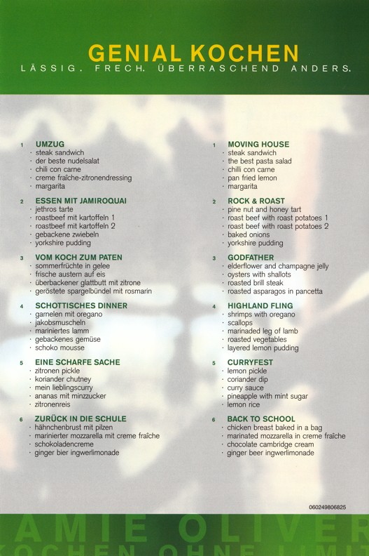 amie Oliver ist alles andere als der reguläre Fernsehkoch. Seit dem er 1997 im trendigen Londoner River Café entdeckt wurde, avancierte er zum Popstar der englischen Kochszene. Sein East-London Akzent, seine strubbeligen Haare, Jeans und sein lockerer Ton sprechen nicht nur Kochfans an, sondern auch diejenigen, die sich vorher nie eine Kochsendung angesehen hätten. Jamies Auftreten und die originellen Rezepte mit Abwandlungen der in der Vergangenheit vielkritisierten englischen Küche, sind das Erfolgsrezept für seine Show.
