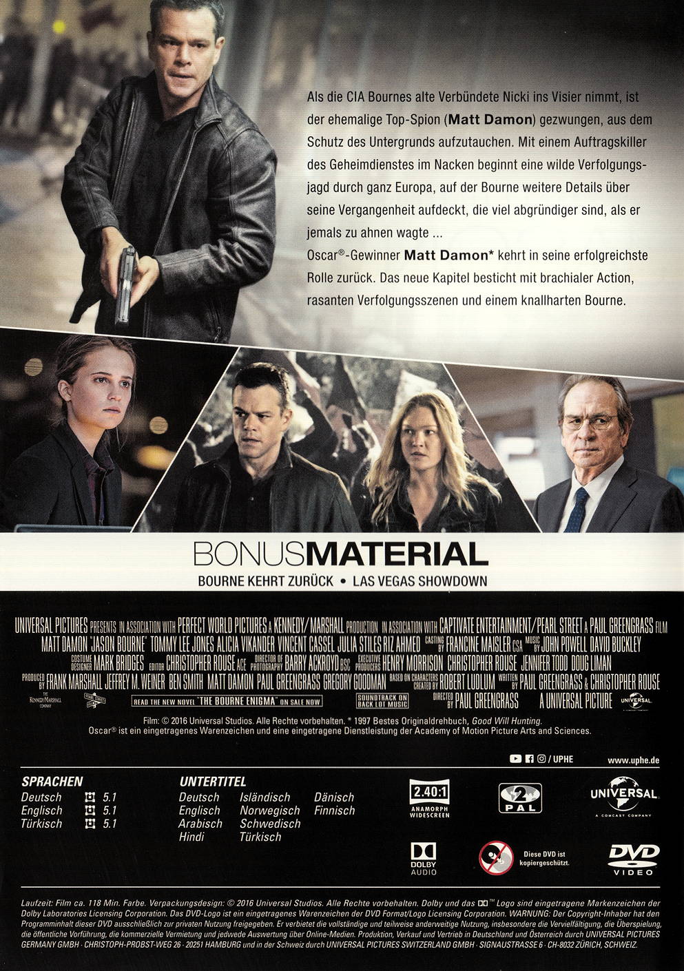 Jason Bourne lebt verborgen im Untergrund. Als seine alte Verbündete Nicky Parsons ins Visier der CIA gerät, taucht Bourne wieder auf, um ihr zu helfen. Mit neuen Informationen zu seiner Vergangenheit konfrontiert, wird dem ehemaligen Top-Spion der CIA bald klar, dass er sich in akuter Lebensgefahr befindet. Denn die CIA hat nicht nur ihre beste Cyber-Spezialistin Heather Lee auf ihn angesetzt, sondern auch einen Spezialagenten, der vor nichts zurückzuschrecken scheint. Die halsbrecherische Flucht vor seinen Gegnern und die Suche nach Vergeltung verschlagen ihn durch ganz Europa und die halbe Welt. Meist mit nicht mehr als seinen blossen Händen bewaffnet, sieht er einer globalen Verschwörung entgegen. Wem kann Bourne trauen - ausser sich selbst?