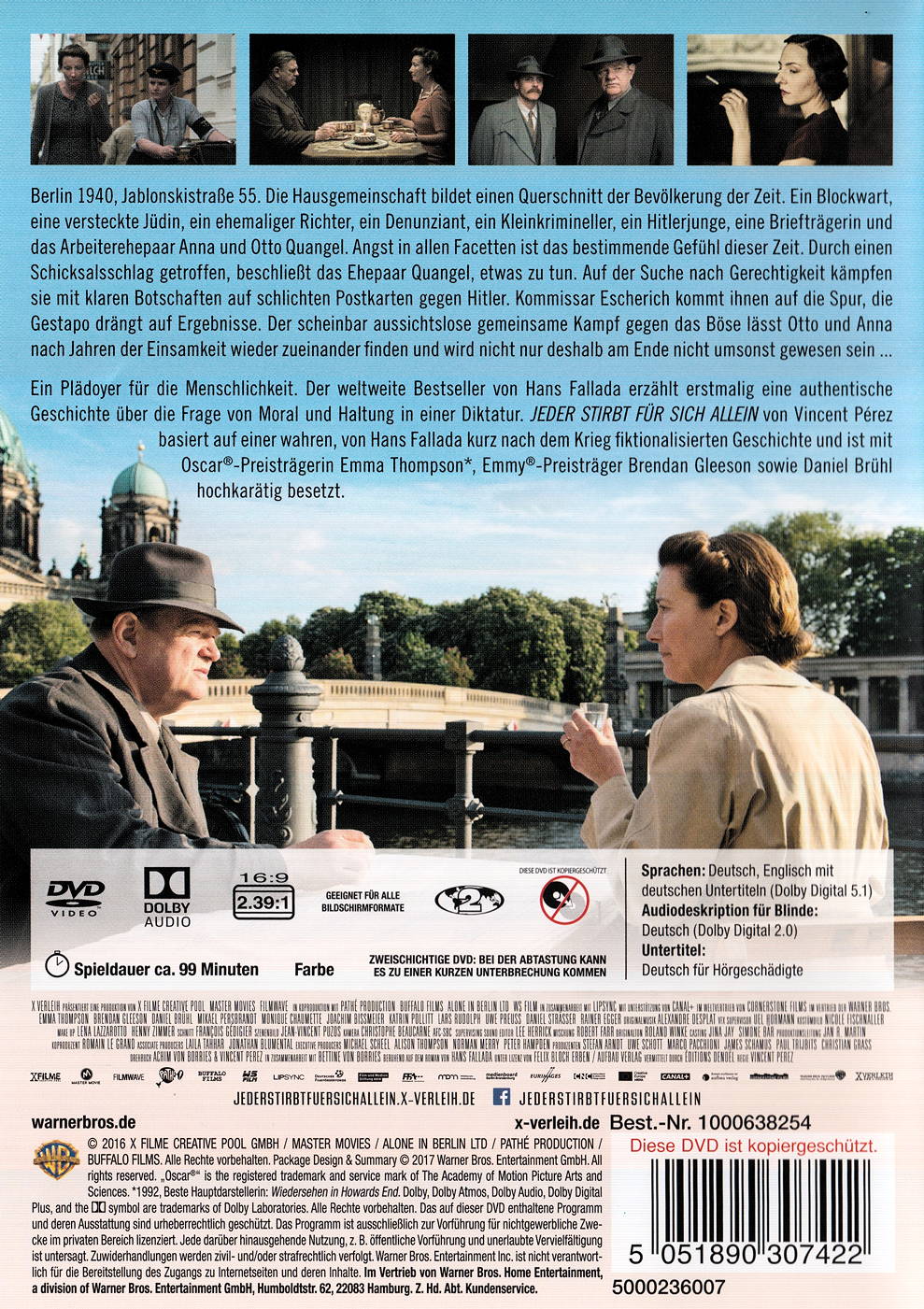 Berlin 1940, Jablonskistrasse 55. Die Hausgemeinschaft bildet einen Querschnitt der Bevölkerung der Zeit. Ein Blockwart, eine versteckte Jüdin, ein ehemaliger Richter, ein Denunziant, ein Kleinkrimineller, ein Hitlerjunge, eine Briefträgerin und das Arbeiterehepaar Anna und Otto Quangel. Angst in allen Facetten ist das bestimmende Gefühl dieser Zeit. Durch einen Schicksalsschlag getroffen, beschliesst das Ehepaar Quangel etwas zu tun. Auf der Suche nach Gerechtigkeit kämpfen sie mit klaren Botschaften auf schlichten Postkarten gegen Hitler. Kommissar Escherich kommt ihnen auf die Spur, die Gestapo drängt auf Ergebnisse. Der scheinbar aussichtslose gemeinsame Kampf gegen das Böse lässt Otto und Anna nach Jahren der Einsamkeit wieder zueinander finden und wird nicht nur deshalb am Ende nicht umsonst gewesen sein...