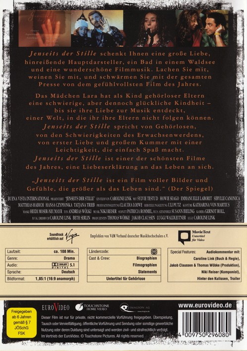 Das Mädchen Lara hat als Kind gehörloser Eltern eine schwierige, aber dennoch glückliche Kindheit - bis sie ihre Liebe zur Musik entdeckt, einer Welt, in die ihr ihre Eltern nicht folgen können. Jenseits der Stille spricht von Gehörlosen, von den Schwierigkeiten des Erwachsenwerdens, von erster Liebe und grossem Kummer mit einer Leichtigkeit, die einfach Spass macht.