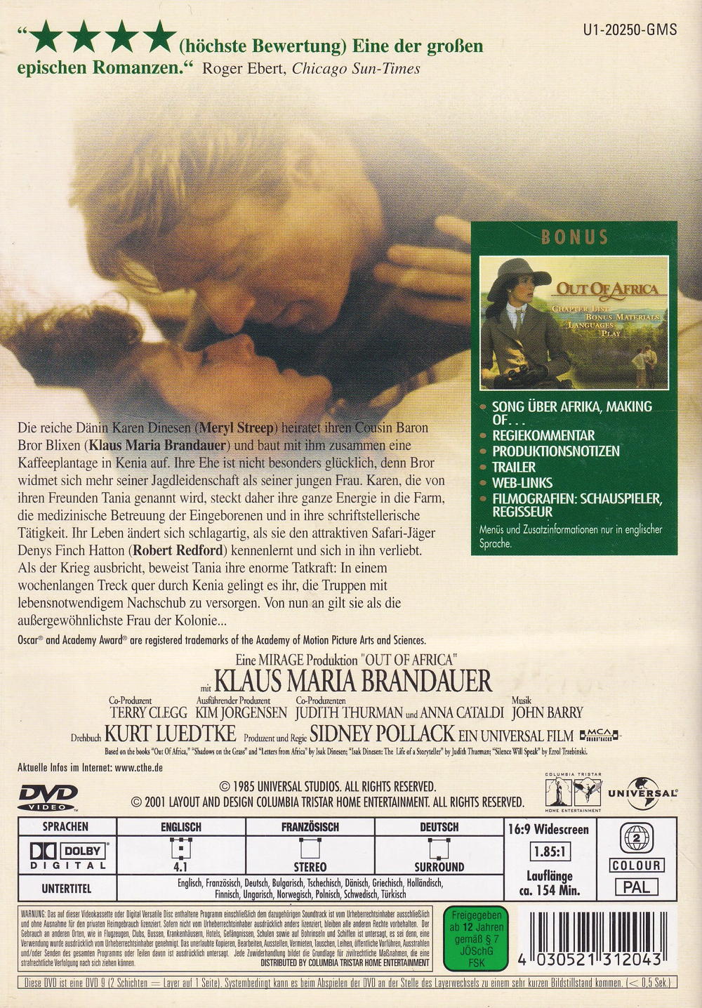 Meryl Streep, Robert Redford, Klaus Maria Brandauer, Michael Kitchen, Malick Bowens, Tania Blixen, Sydney Pollack, David Watkin, Chris Jenkins, Fredric Steinkamp...Kurt Luedtke, Stephen Grimes, Milena Canonero, William Steinkamp, Josie MacAvin, Gary Alexander, Pembroke Herring, Larry Stensvold, Sheldon Kahn, Peter Handford
