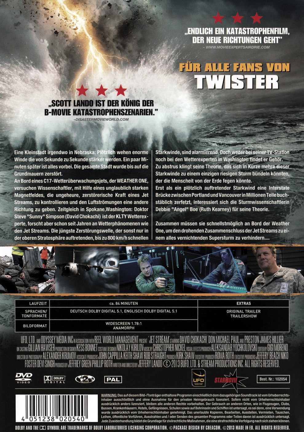 B-Movies über Wetterkatastrophen können recht eintönig geraten. Um dieser Gefahr entgegen zu wirken, haben sie sich etwas einfallen lassen bei "Jet Stream", einem in Bulgarien gedrehten Actionfilm im Auftrage des Syfy Channel: Neben Ehekrisengeschichte und Kompetenzgerangel zwischen Militär und Wissenschaft wird noch ein bisschen Mediensatire und der Punker als Major draufgesattelt. Kein weiter Wurf, aber Desaster-Freunde kommen beim trashigen Spektakel auf ihre Kosten.