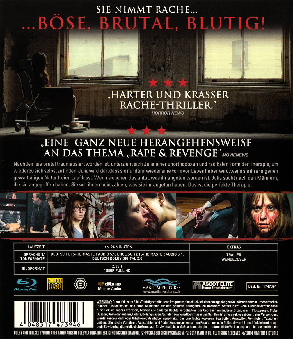Nachdem sie brutal traumatisiert worden ist, unterzieht sich Julia einer unorthodoxen und radikalen Form der Therapie, um wieder zu sich selbst zu finden. Julia wird klar, dass sie nur dann wieder eine Form von Leben haben wird, wenn sie ihrer eigenen gewalttätigen Natur freien Lauf lässt. Wenn sie jenen das antut, was ihr angetan worden ist. Julia sucht nach den Männern, die sie angegriffen haben. Sie will ihnen heimzahlen, was sie ihr angetan haben. Das ist die perfekte Therapie.