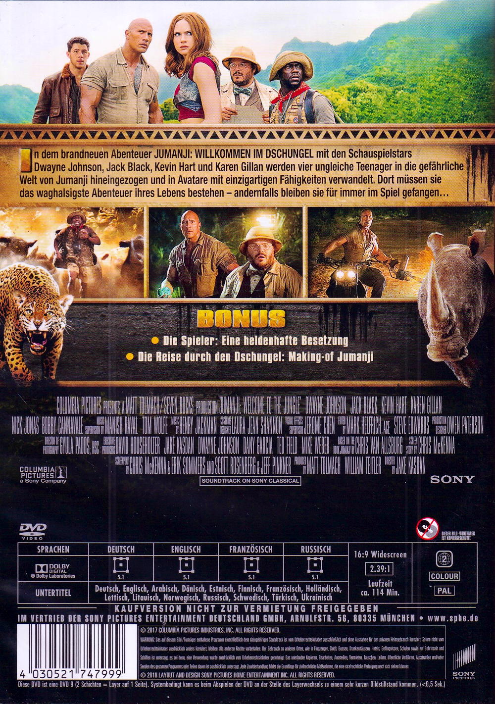 In dem brandneuen Abenteuer JUMANJI: WILLKOMMEN IM DSCHUNGEL mit den Schauspielstars Dwayne Johnson, Jack Black, Kevin Hart und Karen Gillan werden vier ungleiche Teenager in die gefährliche Welt von Jumanji hineingezogen und in Avatare mit einzigartigen Fähigkeiten verwandelt. Dort müssen sie das waghalsigste Abenteuer ihres Lebens bestehen - andernfalls bleiben sie für immer im Spiel gefangen…