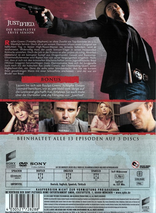 Raylan Givens ist ohne Zweifel ein Top-Ermittler im U.S. Marshals Service. Doch als er an seinem Dienstort Miami einen Gangster am helllichten Tag in bester High-Noon-Manier ins Jenseits befördert, wird er strafversetzt. Widerwillig muss der coole Stetson-Träger in seinen Heimatstaat Kentucky umziehen. Doch der Job in der Provinz ist alles andere als ruhig. Amerikas Hinterland ist ein korrupter Sumpf aus Drogenhandel, Gewalt und Rassismus. Unvermeidlicherweise wird Raylan hier von seiner Vergangenheit eingeholt. Nicht nur, dass er sich mit den kriminellen Machenschaften seines Jugendfreundes Boyd herumschlagen muss. Dummerweise lässt sich der Junggeselle auch noch mit der hübschen Ava, der Cheerleading-Queen seiner Highschool-Zeit, ein. Denn die steht unter Mordverdacht: Ava hat vor kurzem ihren gewalttätigen Mann mit einer Schrotflinte erschossen – und der war ein Bruder von Boyd.