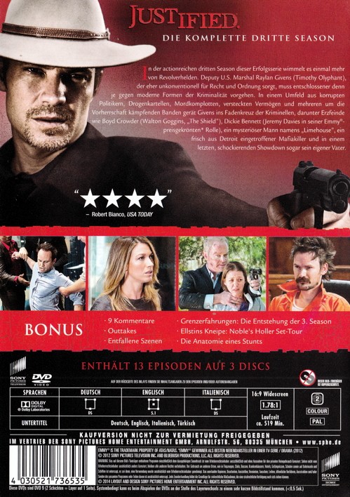 In der actionreichen dritten Staffel dieser Erfolgsserie wimmelt es einmal mehr von Revolverhelden. Deputy U.S. Marshal Raylan Givens, der eher unkonventionell für Recht und Ordnung sorgt, muss entschlossener denn je gegen moderne Formen der Kriminalität vorgehen. In einem Umfeld aus korrupten Politikern, Drogenkartellen, Mordkomplotten, versteckten Vermögen und mehreren um die Vorherrschaft kämpfenden Banden gerät Givens ins Fadenkreuz der Kriminellen, darunter Erzfeinde wie Boyd Crowder, Dickie Bennet, ein mysteriöser Mann namens "Limehouse", ein frisch aus Detroit eingetroffener Mafiakiller und in einem letzten, schockierenden Showdown sogar sein eigener Vater.