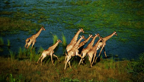 Die längste Zeit des Jahres wirkt die sonnenversengte Welt der Sandwüste gespenstisch leer, durchzogen von Spuren, die scheinbar ins Nichts führen. Dennoch haben sich zahlreiche Tier- und Pflanzenarten hier in der Dürre einen Lebensraum erschaffen. Einmal im Jahr jedoch verwandelt sich die ausgetrocknete Landschaft in ein blühendes Paradies. Nach den ersten ausgiebigen Schauern zeigt die Kalahari ihr zweites Gesicht: gefüllte Wasserlöcher, grüne Weiden und so weit das Auge reicht, nichts als sattes Leben. Vergessen scheinen die Zeiten des grossen Dursts. Und der Fluss Okawango sorgt für eine grüne Oase. Sein Ursprung liegt in den Bergen Angolas und sein Ende formt das weltweit grösste Binnendelta: das berühmte Okawango Delta im Nordosten Botswanas.