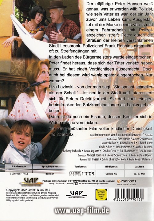 Der elfjährige Peter Hansen weiß genau, was er werden will: Polizist, wie sein Vater es war, der ein Jahr zuvor ums Leben kam. Ausgestattet mit der Marke seines Vaters und einem Fahrradhelm mit Polizeiabzeichen streift Peter durch die Straßen der kleinen verschlafenen Stadt Leesbrook. Polizeichef Frank Robbins nimmt ihn oft zu Streifengängen mit. In den Laden des Bürgermeisters wurde eingebrochen. Peter findet heraus, dass sich der Täter verletzt haben muss. Er hat einen Verdächtigen ausgemacht. Doch auch bei diesem wird wenig später eingebrochen. Nur warumß Liza Lanzinski - von der man sagt: "Sie spricht schneller als der Schall" - ist neu in der Stadt und interessiert sich für Peters Detektivarbeit. Sie darf nach einigen beeindruckenden Satzkombinationen als Lockvogel arbeiten. Dann ist da noch ein Eisauto, dessen Besitzer sich in Widersprüche verstricken...