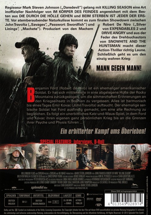 Regisseur Mark Steven Johnson ("Daredevil") gelang mit Killing Season eine Art inoffizieller Nachfolger von Im Körper des Feindes angereichert mit dem Besten aus Die durch die Hölle gehen und Beim Sterben ist jeder der erste. Vor atemberaubender Naturkulisse kommt es zum finalen Showdown zwischen John Travolta ("Savages", "Passwort: Swordfish") und Robert De Niro ("Silver Linings", "Machete"). Produziert von den Machern von Expendables 2 und Drive Angry und aus der Feder des Drehbuchautors von Snowhite and the Huntsman macht dieser Action-Thriller richtig Laune. Schliesslich geht es um den einzig wahren Krieg: MANN GEGEN MANN!