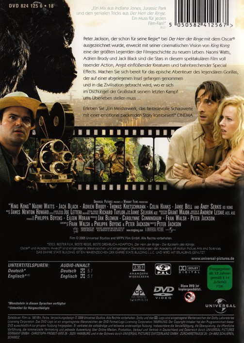 Peter Jackson, der schon für seine Regie bei "Der Herr der Ringe" mit dem Oscar ausgezeichnet wurde, erweckt mit seiner cinematischen Vision von King Kong eine der grössten Legenden der Filmgeschichte zu neuem Leben: Naomi Watts, Adrien Brody und Jack Black sind die Stars in diesem spektakulären Film voll rasender Action, Angst einflössender Kreaturen und bahnbrechender Special Effects. Machen Sie sich bereit für das epische Abenteuer des legendären Gorillas, der auf einer abgelegenen Insel gefangen genommen und in die Zivilisation gebracht wird, wo er sich im Dschungel der Grossstadt seinem letzten Kampf ums Überleben stellen muss...