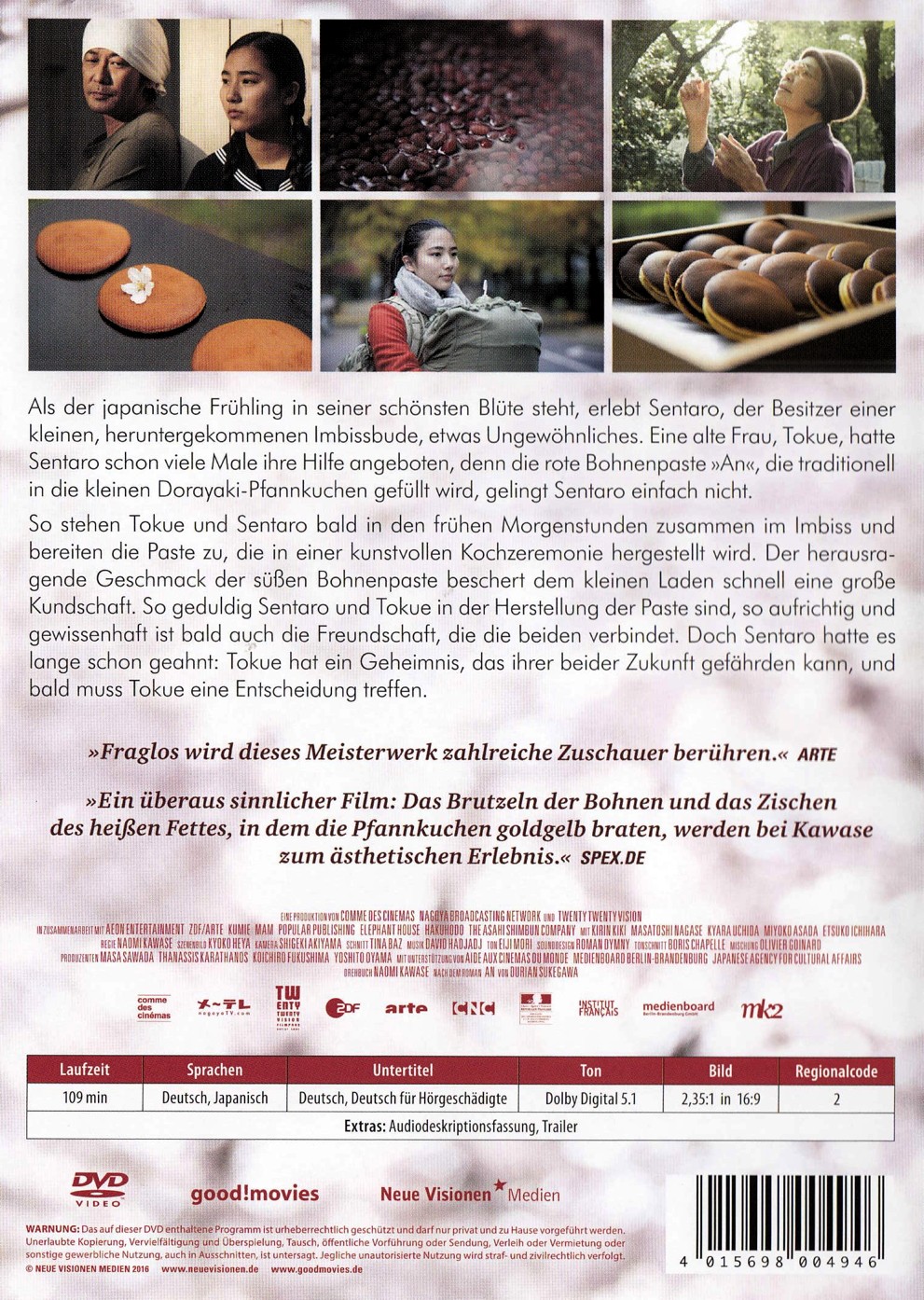 Als der japanische Frühling in seiner schönsten Blüte steht, erlebt der Besitzer einer kleinen, zerschlissenen Imbissbude etwas Ungewöhnliches. Eine alte Frau, Tokue, hatte Sentaro schon viele Male angeboten, ihm in seiner kleinen Wirtschaft auszuhelfen. Denn die rote Bohnenpaste AN, die traditionell in die kleinen Dorayaki-Pfannkuchen gefüllt wird, gelingt Sentaro einfach nicht wie es die alte Kunst verlangt. Als Tokue ihm von ihrer selbst gemachten Bohnenpaste eine Kostprobe gibt, willigt Sentaro schliesslich ein. Bald stehen Tokue und Sentaro in den frühesten Morgenstunden beisammen und bereiten die traditionelle Paste aus roten Bohnen zu, die einer kunstvollen Zeremonie des Kochens und Würzens unterzogen werden müssen. Der herausragende Geschmack der süssen Bohnenpaste beschert dem kleinen Laden schnell eine grosse Kundschaft. So geduldig Sentaro und Tokue in der Herstellung der Paste sind, so aufrichtig und gewissenhaft ist bald auch die Freundschaft, die die beiden verbindet. Doch Sentaro hatte es lange schon geahnt: Tokue hat ein Geheimnis, das ihrer beider Zukunft gefährden kann, und bald muss Tokue eine Entscheidung treffen.
