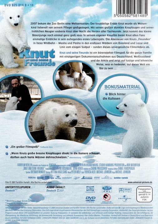 2007 bekam der Zoo Berlin eine Weltsensation: Der knuddelige Eisbär Knut wurde als Waisenkind liebevoll von seinem Pfleger großgezogen. Mit seinen großen dunklen Knopfaugen und seiner fröhlichen Neugier eroberte Knut über Nacht die Herzen aller Tierfreunde. Jetzt kommt das kleine Bärenjunge noch einmal ganz groß raus: In seinem eigenen Kinofilm bietet Knut allen Fans einmalige Einblicke in sein aufregendes erstes Lebensjahr. Die Abenteuer von Knuts "Freunden" in freier Wildbahn - Masha und Pasha in den endlosen Wäldern von Russland und Lasse und Linn vom eisigen Südpol - runden dieses unvergessliche Filmerlebnis ab.