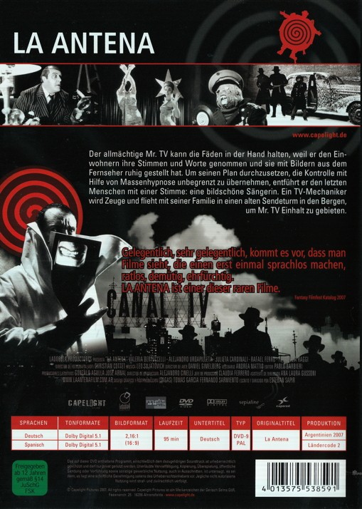 Gelegentlich, sehr gelegentlich, kommt es vor, dass man Filme sieht, die einen erst einmal sprachlos machen, ratlos, demütig, ehrfürchtig. Weil sie sich jeder Kategorisierung entziehen, weil sie ausgetretene Pfade gar nicht erst berühren, weil sie die Grenzen des filmischen Machbaren ausloten und überschreiten, weil sie das Medium benutzen, um mit Bildern etwas zu machen, was man so noch nicht gesehen hat... "La Antena" ist einer dieser raren Filme. Der allmächtige Mr. TV kann die Fäden in der Hand halten, weil er den Einwohnern ihre Stimmen und Wort genommen und sie mit Bildern aus dem Fernseher ruhig gestellt hat. Um seinen Plan durchzusetzen, die Kontrolle mit Hilfe von Massenhypnose unbegrenzt zu übernehmen, entführt er den letzten Menschen mit einer Stimme: eine bildschöne Sängerin. Ein TV-Mechaniker wird Zeuge und flieht mit seiner Familie in einen alten Sendeturm in den Bergen, um Mr. TV Einhalt zu gebieten..