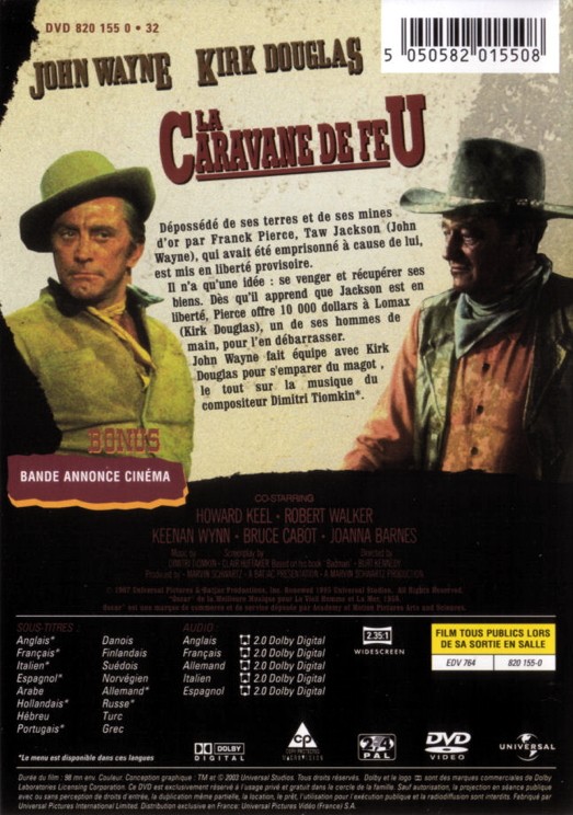 Rencontre au somment entre les deux géants, John Wayne et Kirk Douglas, dans ce western atypique, en plein cur de lOuest ; le premier en cow-boy bafoué, le second en tueur roublard. Bourré daction, de gags et de gadgets, La Caravane de feu est une sympathique et trépidante surprise, aux frontières du film daventure et de la parodie.